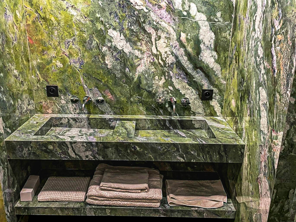 Chez Ceramax, chaque projet commence par une écoute attentive des besoins essentiels de nos clients, que nous nous efforçons d'harmoniser avec la finition et la technicité qui caractérisent notre entreprise. Pour ce projet spécifique, nous avons commandé des plaques de céramique identiques afin d'assurer une continuité parfaite des veinages entre les murs et les pièces façonnées sur mesure. La continuité des veinages est un élément clé dans la conception de cet espace. En utilisant des plaques de céramique soigneusement sélectionnées, nous avons pu créer une harmonie visuelle qui traverse l'ensemble de la pièce, des murs aux plans de travail et aux vasques. Cette technique permet non seulement d'améliorer l'esthétique globale, mais aussi de garantir une cohérence et une fluidité dans le design.